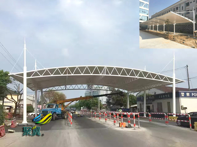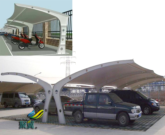 膜結(jié)構(gòu)車棚是建在建筑空地,起到遮陽避雨的作用,或設(shè)在建筑物出入口膜結(jié)構(gòu)或頂部陽臺上方用來或,或者避免高空有墜落物砸落下來,起到維護作用的一種建筑。