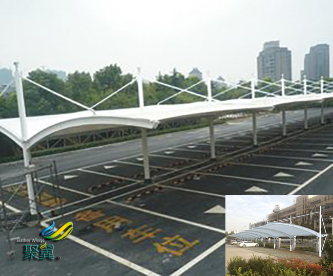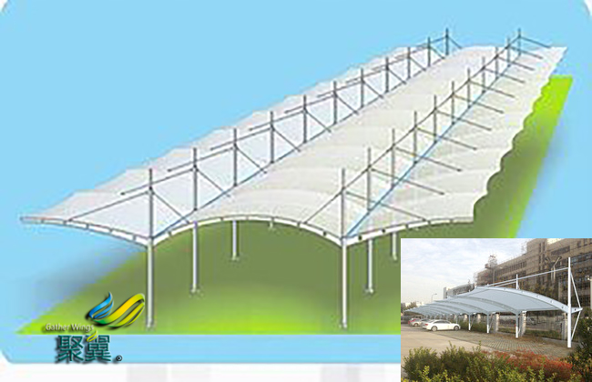 膜結(jié)構(gòu)車棚選用進口PVDF膜材料配鋼結(jié)構(gòu)骨架,表面處理采用進口船用底漆。