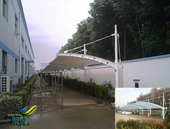 膜結(jié)構(gòu)車棚是在超細(xì)玻璃纖維織物上涂以聚四氟乙烯樹脂而成的材料。這種膜材有較好的焊接性能,有優(yōu)良的抗紫外線、抗老化性能和阻燃性能。
