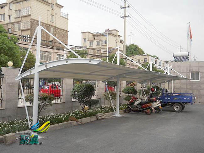 膜結(jié)構(gòu)車棚荷載態(tài)分析:張拉膜結(jié)構(gòu)車棚自身重量很輕,僅為鋼結(jié)構(gòu)的1/5,混凝土結(jié)構(gòu)的1/40;因此膜結(jié)構(gòu)車棚對地震力有良好的適應(yīng)性,而對風(fēng)的作用較為敏感。此外還要考慮雪荷載和活荷載的作用,由于目前觀測資料尚少,故對膜結(jié)構(gòu)車棚的設(shè)計通常采用安全系數(shù)法。