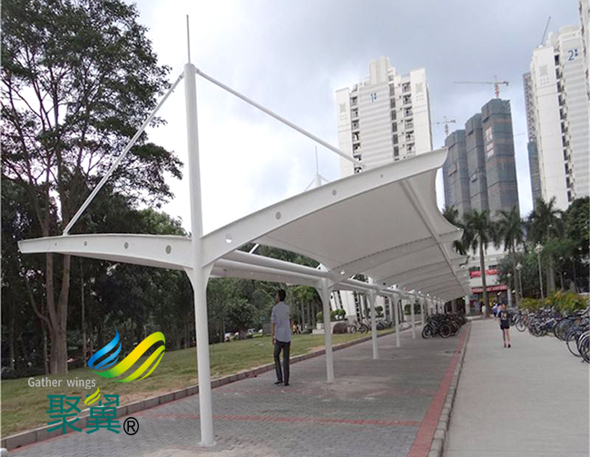 膜結(jié)構(gòu)車棚藝術(shù)性:除了一般雨蓬不可比擬的實用、耐用、遮風擋雨的功能外,膜結(jié)構(gòu)雨蓬更是一座雕塑,一件藝術(shù)品,膜結(jié)構(gòu)車棚給人美的視覺享受。