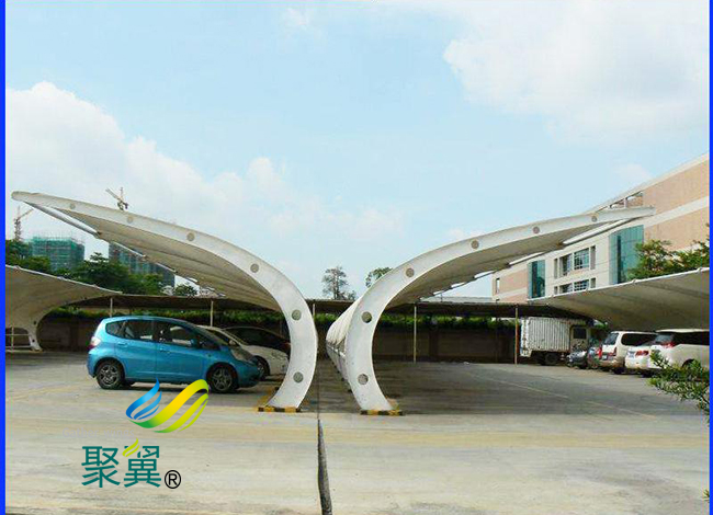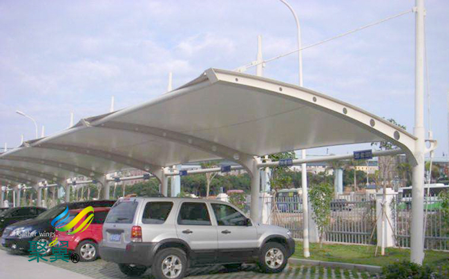 預(yù)張力和二次張拉,膜結(jié)構(gòu)車棚的穩(wěn)定依賴于膜結(jié)構(gòu)內(nèi)的預(yù)應(yīng)力的保持。預(yù)應(yīng)力的水平影響膜在荷載作用下的變形。因?yàn)槟そY(jié)構(gòu)在荷載的持續(xù)作用下會產(chǎn)生松弛,所以在使用期間膜結(jié)構(gòu)車棚膜內(nèi)預(yù)應(yīng)力會發(fā)生變化。用于特定結(jié)構(gòu)的膜材性能可以通過雙軸實(shí)驗(yàn)來確定,并應(yīng)用于預(yù)應(yīng)力設(shè)計中。處理膜結(jié)構(gòu)車棚膜材在使用期間產(chǎn)生的松弛和徐變的處理方式有兩種,其一是安裝時施加一個較高的初始應(yīng)力,其二是使用一段時間之后實(shí)施二次張拉。