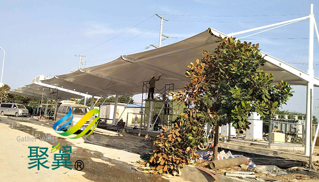 在完工后的維護(hù)工作也是相當(dāng)重要的,膜面上污垢的堆積與當(dāng)?shù)氐沫h(huán)境條件、膜結(jié)構(gòu)車棚膜材特性和膜面的形狀有關(guān)。從技術(shù)的角度看,膜結(jié)構(gòu)車棚不需要清洗。