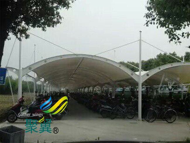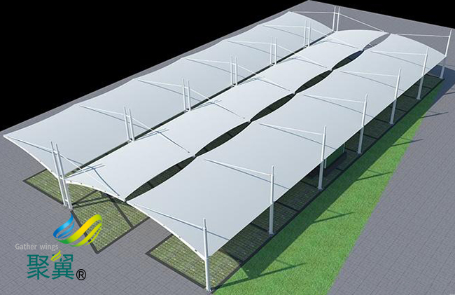 膜結構車棚值得一提的是它可以根據(jù)支撐構件的位置和高低排列組成不同的形狀,這在金屬車棚上是無法想象的,所以膜結構車棚可以通過自身柔美的曲線和周圍的藝術景觀結合起來,給人以美的享受。