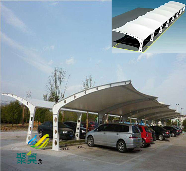 膜結構車棚具有良好的環(huán)保性、透光性、自清潔性,膜材表面采用PVDF(聚偏二氟乙烯)涂層、或二氧化鈦涂層,具有較好的隔熱效果,對太陽熱能可反射掉70%,膜結構車棚膜材本身吸收了17%,傳熱13%,而透光率卻在20%以上,經過10年的太陽光直接照射,膜結構車棚輝度仍能保留70%。