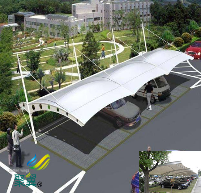 膜結(jié)構(gòu)車棚抵御風雨的能力是普通遮陽篷無法比擬的。特別是在暴風雨天氣中,膜結(jié)構(gòu)建筑物是固定的,不會被損壞。