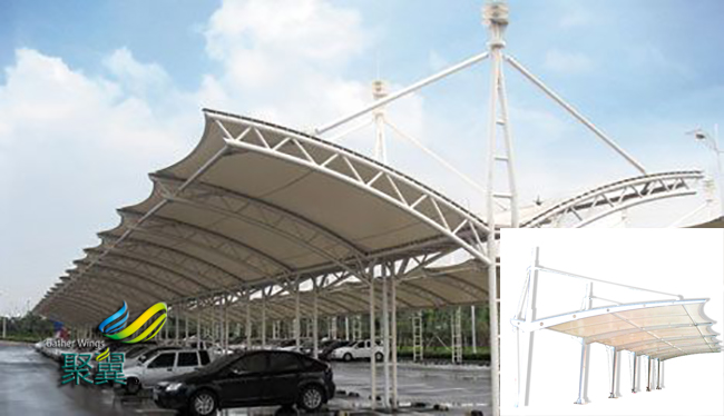 膜結(jié)構(gòu)車棚的篷布材質(zhì)是膜結(jié)構(gòu),而膜材的最大特點(diǎn)是強(qiáng)度高、耐久性好、防火難燃、自潔性好,不受紫外線影響,使用壽命長,一般15-30年。具有高透光率,透光率為13%,對熱能反射率73%,熱吸收量很少。正是因?yàn)檫@種劃時(shí)代的膜材料的發(fā)明,使膜結(jié)構(gòu)車棚成為現(xiàn)代化的永久建筑。