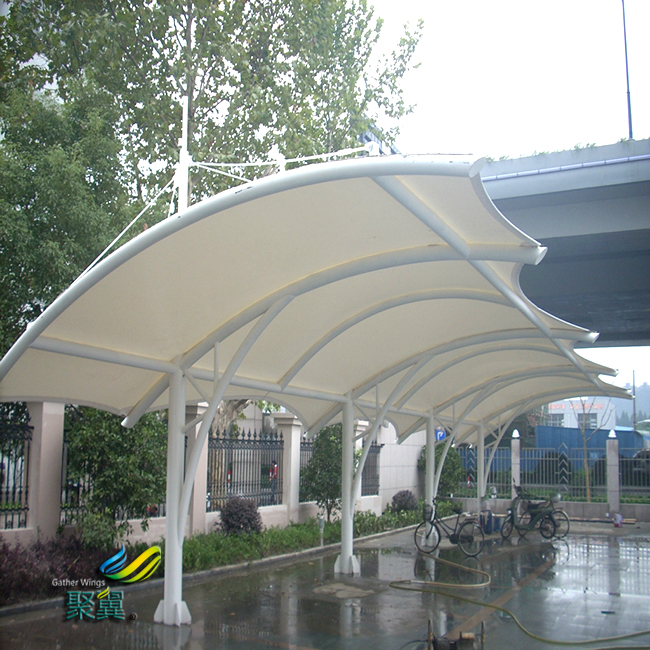膜結(jié)構(gòu)車棚遮陽雨篷設(shè)計獨特,新穎別致,一篷多用!膜結(jié)構(gòu)車棚防雨、遮陽、擋風(fēng)、擋風(fēng)沙。多款電動車、摩托車、自行車都適合安裝。讓普通膜結(jié)構(gòu)車棚電動車享受“轎車”的時尚,膜結(jié)構(gòu)車棚成為了靚麗城市風(fēng)景。