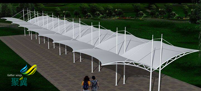 膜結(jié)構(gòu)車棚美觀大方,空間跨度大。較好地體現(xiàn)了膜結(jié)構(gòu)空間跨度大、施工周期短的優(yōu)點(diǎn)。由于越來(lái)越多的膜結(jié)構(gòu)車棚取代傳統(tǒng)的混凝土結(jié)構(gòu),膜結(jié)構(gòu)車棚的特性越來(lái)越受到人們的重視。