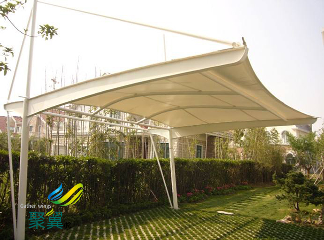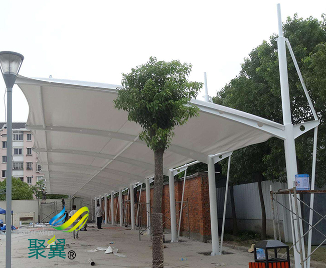 這種產(chǎn)品的首要要求就是耐用穩(wěn)固,膜結(jié)構(gòu)車棚都是鋼構(gòu)支撐柱,然后其上進行焊接等工藝加裝膜結(jié)構(gòu)車棚膜材料頂棚。