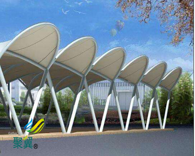 該膜結(jié)構(gòu)車棚膜材在我國既有的膜結(jié)構(gòu)建筑上廣泛使用,目前的發(fā)展趨勢是逐漸被PTFE建筑膜材所取代。膜結(jié)構(gòu)車棚PVC材料的主要特點是強度低、彈性大、易老化、徐變大、自潔性差,但價格便宜,容易加工制作,色彩豐富,抗折疊性能好。為改善膜結(jié)構(gòu)車棚性能,可在膜結(jié)構(gòu)車棚表面涂一層聚四氟乙烯涂層,提高膜結(jié)構(gòu)車棚抗老化和自潔能力,膜結(jié)構(gòu)車棚壽命可達到15年左右。