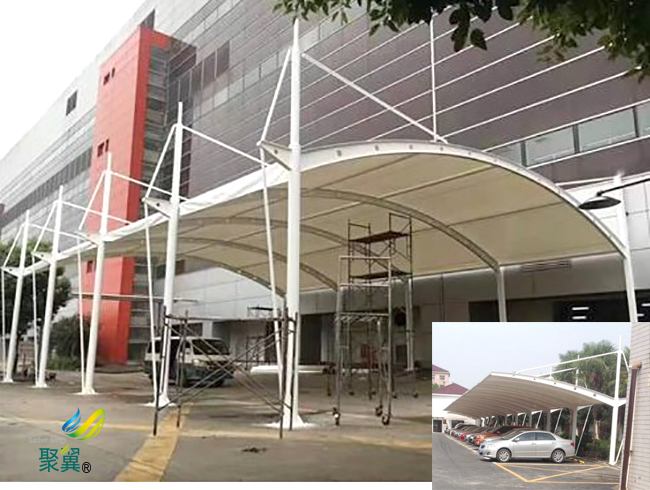 工期短。膜結(jié)構(gòu)車棚膜片的裁剪、鋼索及鋼結(jié)構(gòu)等的制作均在工廠完成,減少現(xiàn)場施工時間,可與下部鋼筋混凝土結(jié)構(gòu)或構(gòu)件等同時進行,避免施工交叉,在施工現(xiàn)場只是鋼索、鋼結(jié)構(gòu)及膜片的連接安裝定位及張拉的過程,故膜結(jié)構(gòu)車棚現(xiàn)場施工安裝、迅速快捷,相對傳統(tǒng)建筑工程工期較短。