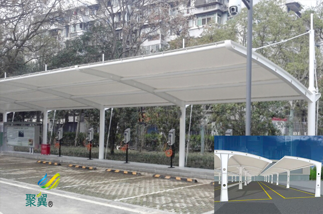 膜結(jié)構(gòu)車棚具有良好的環(huán)保性、透光性、自清潔性,膜材表面采用PVDF(聚偏二氟乙烯)涂層、或二氧化鈦涂層,具有較好的隔熱效果,對太陽熱能可反射掉70%, 膜結(jié)構(gòu)車棚膜材本身吸收了17%,傳熱13%,而透光率卻在20%以上,經(jīng)過10年的太陽光直接照射,其輝度仍能保留70%。