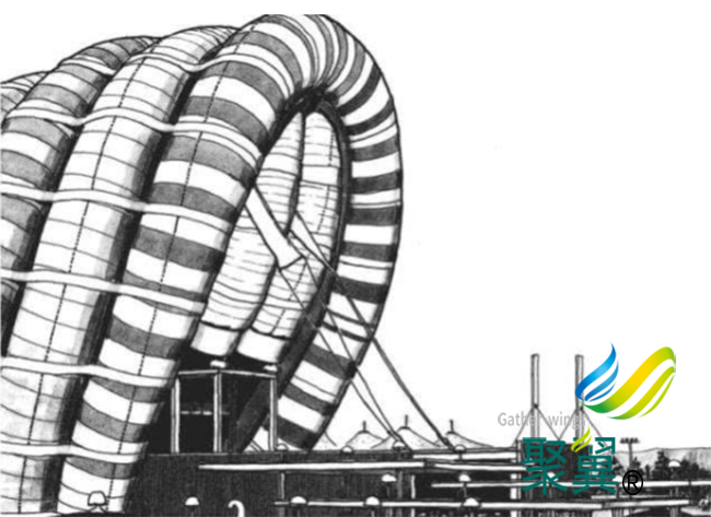 美國(guó)館(建筑設(shè)計(jì):L戴蜂斯;結(jié)構(gòu)設(shè)計(jì):藍(lán)格)是典型的充氣穹頂。在具有近似于長(zhǎng)軸142m,短軸83.5m的橢圓的平面形狀的壓環(huán)的內(nèi)側(cè),用索張拉剛度加強(qiáng)的皮膜《用聚飄乙烯嘎涂的玻穗纖緣布),室內(nèi)的氣壓相對(duì)于外側(cè)氣壓要稍微高(用水柱為30mm、用水銀柱為2.3mm由于值較小。通常用水柱表示).所以這種方式構(gòu)成屋面結(jié)構(gòu)。與跨度相比,此穹頂?shù)奶卣魇谴苟确浅5汀?.lm)。垂度低的穹頂中,風(fēng)荷載分布比較均勻(吸力),這對(duì)膜結(jié)構(gòu)的設(shè)計(jì)非常有利。此性質(zhì)極大促進(jìn)了之后的低垂度充氣穹頂?shù)陌l(fā)展