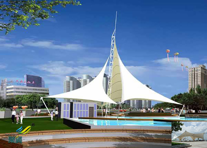 另外由于膜材料本身特有的顯色性,在夜間彩燈的映射下能形成絢麗繽紛的景觀。不僅為人們提供遮陽(yáng)避雨的空間。同時(shí),更由于這種生動(dòng)活潑的造型能給人們帶來時(shí)尚、輕松的休閑感受,所以廣受歡迎。