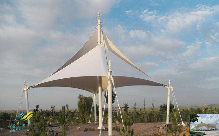景觀張拉膜能提供豐富多彩的用途,并與園林景觀溶為一體。創(chuàng)造出讓人們盡情享受的快樂空間。充分展示了結(jié)構(gòu)構(gòu)件清晰受力的藝術(shù)之美,它巧妙的整合周圍的環(huán)境,給人們一種高貴典雅、浪漫溫馨之感。
