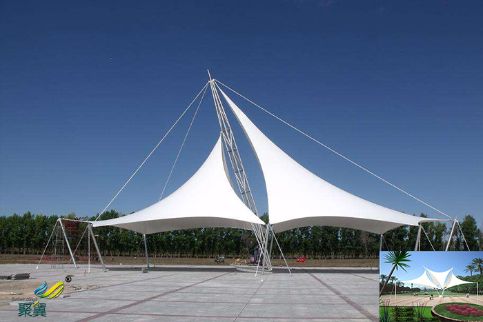 景觀膜結(jié)構(gòu)工程能提供豐富多彩的用途,并與園林景觀、公園景觀溶為一體,創(chuàng)造出讓人們盡情享受的快樂空間,充分展示了景觀膜結(jié)構(gòu)構(gòu)件清晰受力的藝術(shù)之美,它巧妙的整合了周圍的環(huán)境,帶給人們一種高貴典雅、浪漫溫馨之感。另外由于膜材料本身特有的顯色性,在夜間彩燈的映射下能形成絢麗繽紛的景觀。 不僅給人們提供遮陽避雨的空間,同時,也由于這種生動活潑的造型能給人們帶來時尚、簡約的休閑感受,所以廣受大眾歡迎。