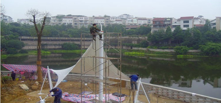 此款式張拉景觀采用進口PVDF膜布材料自潔性好,不易污染空氣中的塵土,型號采用JY-100GS,表面依靠降雨清洗效果明顯。鋼結構采用Q235熱鍍鋅加工工藝而成永不生銹,表面環(huán)氧富鋅底漆配綠化橡膠面漆。
