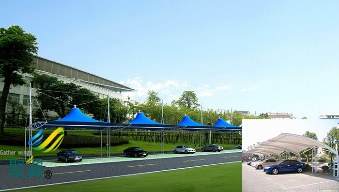 2.膜結構車棚對太陽光具有高反射率和低吸收率,可以靠最小的熱容量抑制太陽能源向結構建筑物內滲透。同時,因其具有半透明的特點,白天不比使用人工照明,實質上可以節(jié)省能源成本。