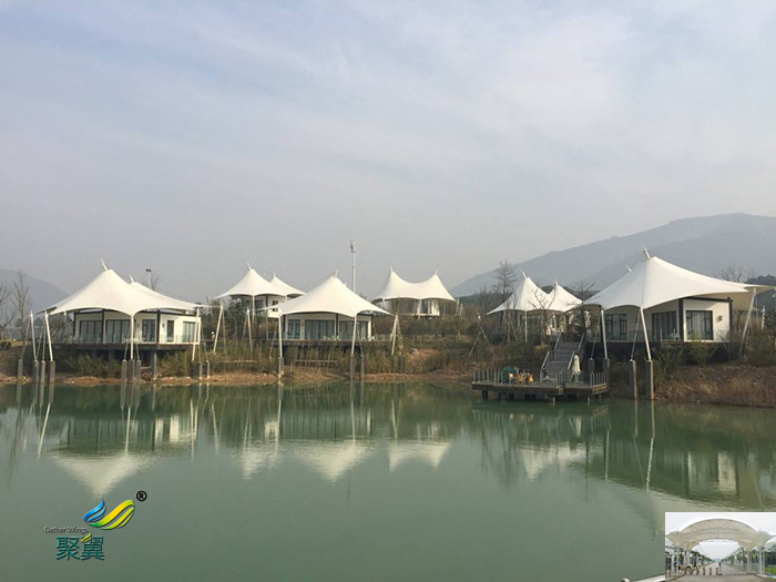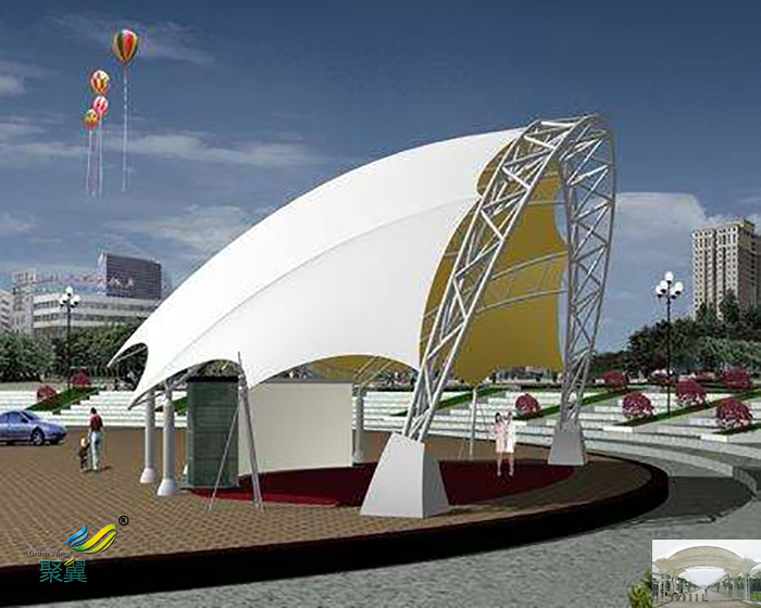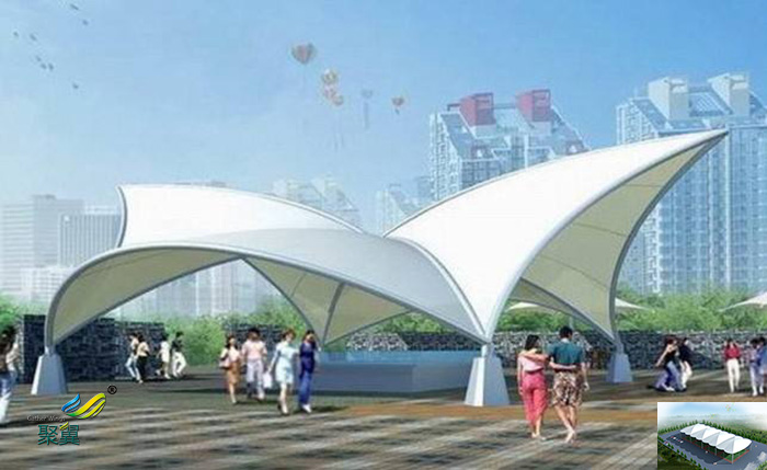 2.張拉膜傘景觀棚經(jīng)濟(jì)性:由于膜材具有一定的透光率,白天可減少照明強(qiáng)度和時間,能很好地節(jié)約能源。同時夜間彩燈透射形成的絢爛景觀也能達(dá)到很好的廣告宣傳效益。膜建筑屋面重量僅為常規(guī)鋼屋面的1/30,這就降低了墻體和基礎(chǔ)的造價。同時膜建筑奇特的造型和夜景效果有明顯的“建筑可識性”和商業(yè)效應(yīng),其價格效益比更高。
