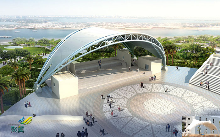 2.舞臺(tái)遮陽篷膜結(jié)構(gòu)具有特定功用的修建都可經(jīng)過立意得以表達(dá),舞臺(tái)膜結(jié)構(gòu)的共同外形表現(xiàn)了修建自身的天然美感。