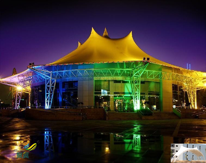 2.舞臺膜結構雨棚具有特定功用的修建都可經過立意得以表達,舞臺膜結構的共同外形表現了修建自身的天然美感。