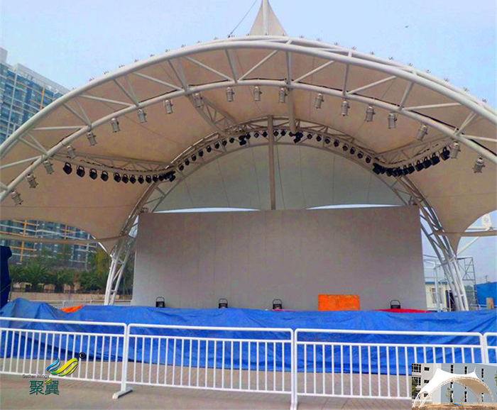 2.舞臺(tái)膜結(jié)構(gòu)遮陽(yáng)篷雨棚具有特定功用的修建都可經(jīng)過(guò)立意得以表達(dá),舞臺(tái)膜結(jié)構(gòu)的共同外形表現(xiàn)了修建自身的天然美感。