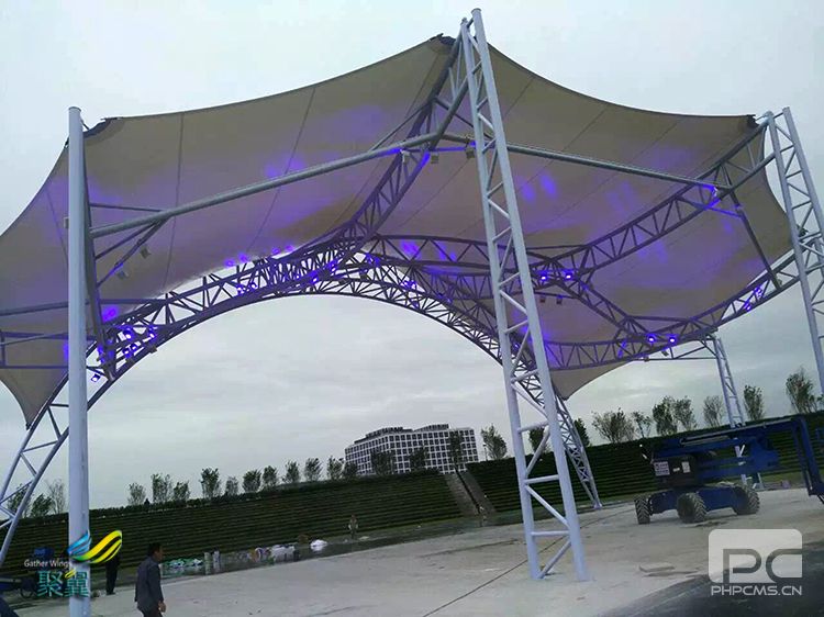 夜間舞臺(tái)柔性材料具有透光和防紫外線(xiàn)功能,室外建筑和環(huán)境小品中得到廣泛 的應(yīng)用。夜間舞臺(tái)晚間的燈光設(shè)計(jì)使膜結(jié)構(gòu)具有鮮明的環(huán)境標(biāo)志性特征 。