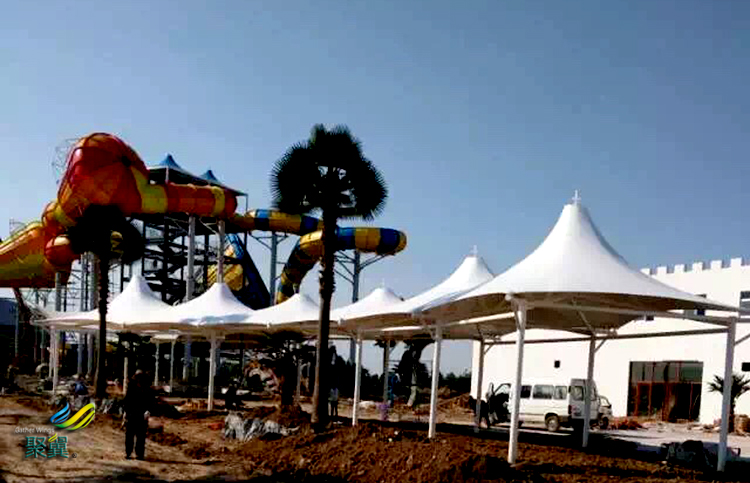 膜結(jié)構(gòu)連角傘冒頂式,整體新穎,采用白色膜材,鋼材采用圓鋼,整體經(jīng)設(shè)計師專業(yè)設(shè)計,保證了膜結(jié)構(gòu)連角傘的安全性。