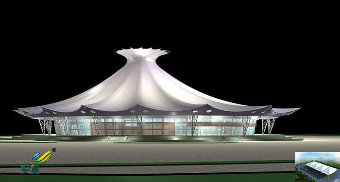 2.膜結(jié)構(gòu)建筑經(jīng)濟性:由于膜材具有一定的透光率,白天可減少照明強度和時間,能很好地節(jié)約能源。同時夜間彩燈透射形成的絢爛景觀也能達到很好的廣告宣傳效益