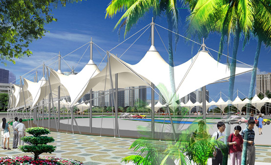商業(yè)街膜結(jié)構(gòu)型遮陽(yáng)采用進(jìn)口膜材,光澤細(xì)膩耐用性強(qiáng),使用壽命長(zhǎng)達(dá)15-30年。采用鋼結(jié)構(gòu)成的骨架,在其上方張拉膜材的構(gòu)造形式。下部支撐結(jié)構(gòu)安定性高,造型可復(fù)雜,開口部易受限制,精確度要求高,可根據(jù)預(yù)算結(jié)合實(shí)際環(huán)境等特點(diǎn)設(shè)計(jì),可用于任何大小規(guī)模的空間。