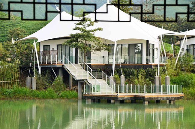 度假酒店小木屋膜結構棚裝飾著環(huán)境,度假酒店小木屋膜結構棚自由、輕巧又不失柔美,使得人們生活感到疲勞時,能在這種環(huán)境存在地找到歸屬感,緩解人們的疲勞。度假酒店小木屋膜結構棚光學美感氟碳纖膜材料的透射率約為6%,在日照下結構內部具通透性和明亮度,能滿足內部設備檢修的需求。