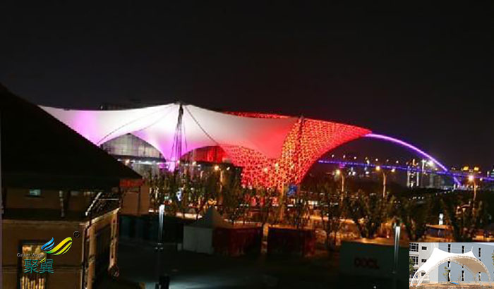 膜結(jié)構(gòu)看臺無論室內(nèi)還是室外這種雕塑般的質(zhì)感都令人激動。夜晚的燈光使膜結(jié)構(gòu)具有強烈的雕塑感張拉膜結(jié)構(gòu)