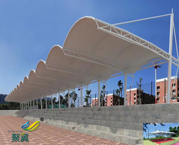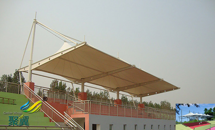 為了解決鋼構配合鋁塑板的弊病,膜結(jié)構慢慢進入了看臺市場,相比傳統(tǒng)的建筑形式膜結(jié)構體育看臺的優(yōu)點很多:首先它不僅滿足了造型的多樣性、夸張性,而且也完美的解決了對于大跨度結(jié)構用鋼量大的問題,往往對于大跨度的結(jié)構來說,起跨度尺寸就代表著需要大量的鋼結(jié)構來補足,然而對于膜結(jié)構來說,其特有的延展性和超高的的抗拉強度完美的解決了大跨度帶來的困擾,大大的節(jié)約了施工成本。
