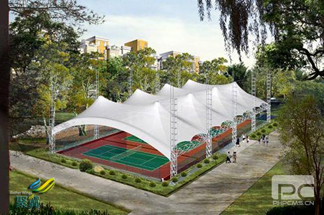 大型膜結(jié)構(gòu)體育館景觀索膜是依靠膜自身的張拉應(yīng)力與支撐桿和拉索共同構(gòu)成機構(gòu)體系。索膜結(jié)構(gòu)是用高強度柔性薄膜材料經(jīng)受其它材料的拉壓作用而形成的穩(wěn)定曲面,能承受一定外荷載的 空間結(jié)構(gòu)形式。