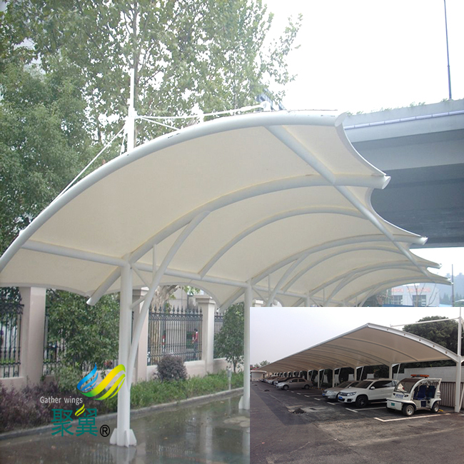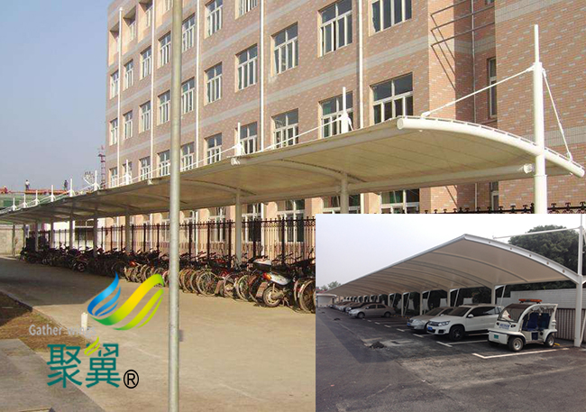 膜結(jié)構(gòu)車棚的頂部采用的是膜結(jié)構(gòu)優(yōu)質(zhì)材質(zhì),膜結(jié)構(gòu)車棚透光透景、低碳節(jié)能、綠色環(huán)保、遮陽隔熱、膜結(jié)構(gòu)車棚抗風(fēng)抗壓、防火阻燃、自潔易潔、時尚美觀等,所以被越來越多的人所接受。