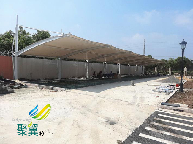 膜結(jié)構(gòu)車棚具有不易燃性、高強(qiáng)度、耐氣侯變化性以及優(yōu)良的幾何穩(wěn)定性。 膜結(jié)構(gòu)車棚PVC對(duì)氧化劑、還原劑和強(qiáng)酸都有很強(qiáng)的抵抗力、材料用途極廣、 膜結(jié)構(gòu)車棚具有加工性能良好、制造成本低、耐腐蝕、絕緣等良好特點(diǎn)。