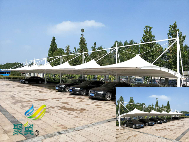 景觀張拉膜停車棚 、汽車棚尺寸,景觀張拉膜停車棚遮陽防雨,膜結構車棚PVC獨特的性能(防雨,耐火,抗靜電,易成型),景觀張拉膜停車棚 、汽車棚PVC低投入高產量的特點,膜結構車棚組裝的時分**簡單。