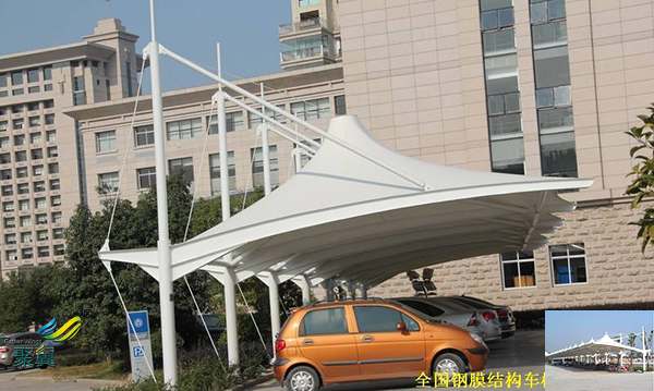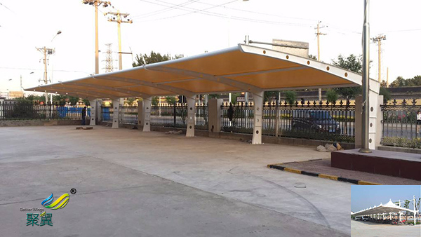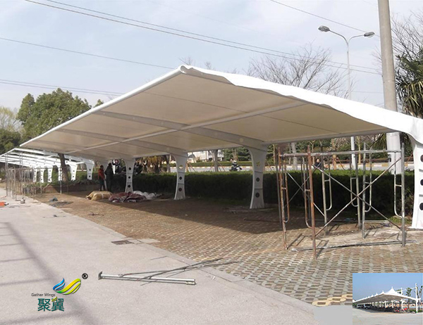 膜結(jié)構(gòu)自行車車棚具有耐熱性、耐氣候性、耐藥物性、高強度、防火等特性,而且不易老化,經(jīng)過長期使用仍能保持其最初時的強度。如今廣泛使用的膜材料能很好地滿足對于防火的需求,具有卓越的阻燃和耐高溫性能。