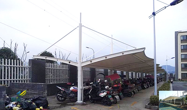 膜結(jié)構(gòu)車棚建筑膜材具有輕質(zhì)、柔韌、厚度小、透光性好;對(duì)自然光有反射、吸收和透射能力;它不燃(難燃或阻燃);具有耐久、防火、氣密良好等特性;表面經(jīng)氟素處理(涂覆PVF或PVDF)的膜材、自身不發(fā)粘、有很好的自潔性能。