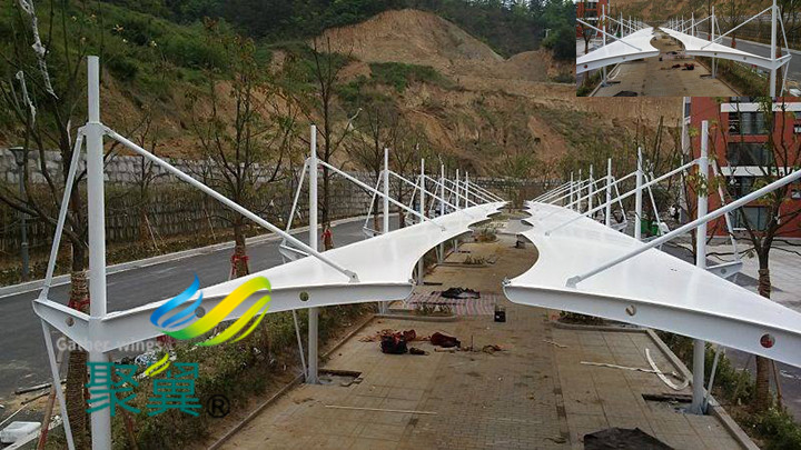 膜結(jié)構(gòu)車棚汽車停車棚耐候性:表面有防紫外線共擠層,可防止太陽紫外線引起的材料變黃,表面共擠層具有化學(xué)縐吸收紫外線并轉(zhuǎn)化為可見光。