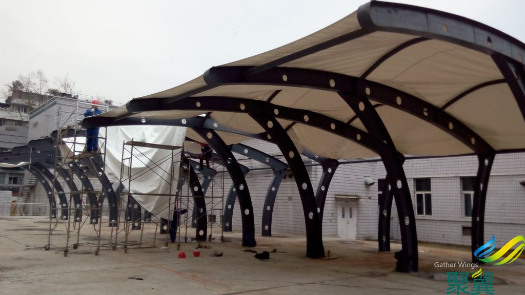 3.藝術(shù)性:一般膜結(jié)構(gòu)車棚的設(shè)計(jì),會(huì)結(jié)合建筑師的創(chuàng)意,利用色彩學(xué)為依托,造出傳統(tǒng)建筑難以實(shí)現(xiàn)的曲線及造型,如果建筑師的設(shè)計(jì)思維夠創(chuàng)新,往往車棚的藝術(shù)性更能得到體現(xiàn)