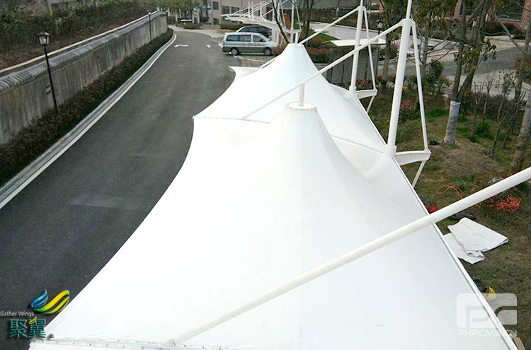 黃山帽頂膜結(jié)構(gòu)車棚PVDF膜材由織物和涂層復(fù)合而成,具有質(zhì)地柔韌、厚度小、重量輕、透光性好的特點(diǎn)。對(duì)自然光有反射、吸收和透射能力,不燃、難燃或阻燃,具有良好的耐久、防火、氣密等特性;黃山帽頂膜結(jié)構(gòu)車棚外表經(jīng)過(guò)氟素處理的膜材抗老化性好,具有較好的自潔性能。