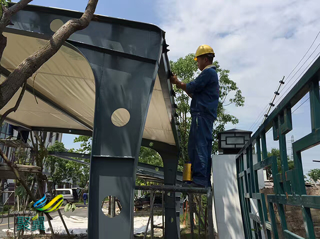 膜結(jié)構(gòu)車棚其加工方法是把玻纖織物多次快速放入特氟隆熔體中,使織物兩面皆有均勻的特氟隆涂層,使永久性的膜結(jié)構(gòu)車棚正式誕生。其柔美,其曲線,其剛?cè)岵?,其豐富造型,其潔白無瑕,讓人眼前一亮,回味悠長。