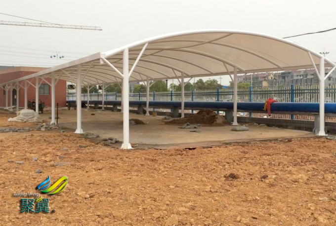 第二點:膜結(jié)構車棚的排水措施。由于膜結(jié)構車棚本身使用的膜材具有較強的張拉性能,而這種張拉性能很容易使得膜結(jié)構因為受到較大重力的擠壓作用而產(chǎn)生一定的變形,當遇到雨雪天氣的時候這種變形就會使得雨水堆積在凹處不能及時排出去,長期不僅會破壞膜結(jié)構車棚膜材而且還會導致膜結(jié)構因為受到雨水而腐蝕,嚴重影響停車棚質(zhì)量,因此在施工的時候必須做好排水措施。