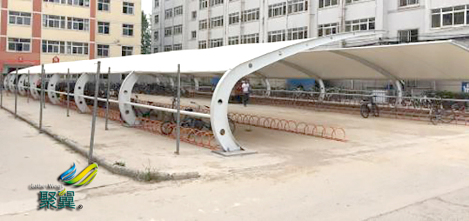 膜結(jié)構(gòu)停車棚—自行車車棚:自行車棚材料的膜材料最大的特點(diǎn)是強(qiáng)度高,耐久性好,防火阻燃,清潔性好,不受紫外線輻射的影響,使用壽命長(zhǎng),一般15-30年。膜結(jié)構(gòu)停車棚高透光,透光透光率是13%,73%的反射熱量,熱量可以吸收一些。