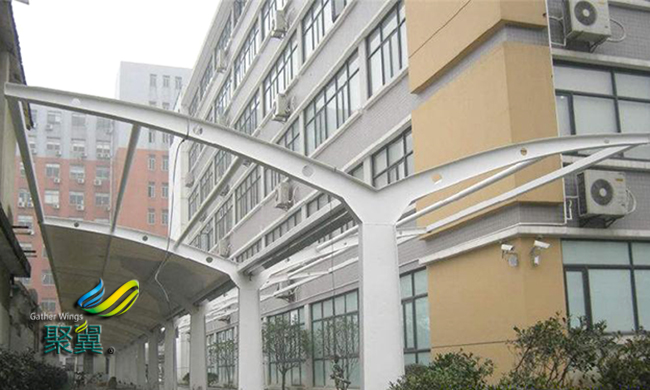 膜結(jié)構(gòu)車棚所用膜材一般由基材、涂層、面層組成,常用的基材主要有玻璃纖維織物與聚酯纖維織物,而涂層則有聚氯乙烯(PVC)和聚四氟乙烯(PTFE)?;慕M織一般采用平紋,織造工藝較為簡單,應(yīng)用最為廣泛。