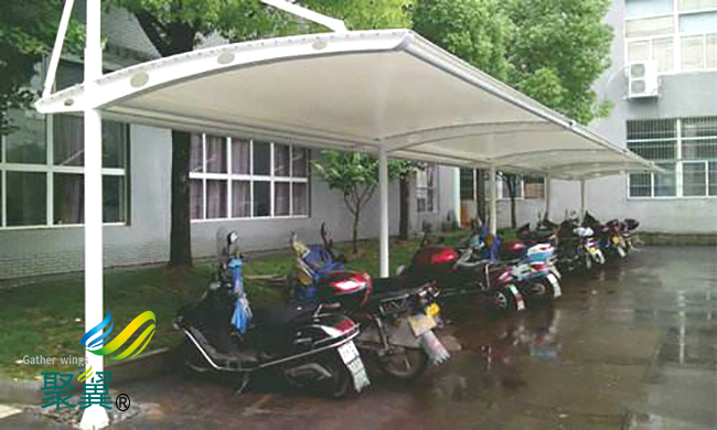 膜結(jié)構(gòu)車棚常用膜材為聚酯纖維覆聚氯乙烯(PVC)和玻璃纖維覆聚聚四氟乙(Teflon)。
