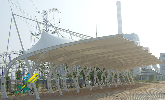 膜結(jié)構(gòu)車棚膜材料是一種完全“柔性”的材料,又是一種介乎不透明的鋼或混凝土與全透明的玻璃之間的“半透光”的材料。