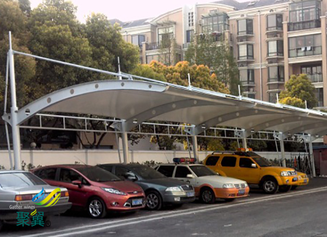 膜結(jié)構(gòu)車棚具有自潔性,膜結(jié)構(gòu)車棚的自潔性主要是膜材料表面加涂了防護(hù)層,防護(hù)層主要是聚氟乙烯、丙烯酸等構(gòu)成可耐高溫,不會(huì)發(fā)粘,從而在落到膜結(jié)構(gòu)車棚膜材料的灰塵可依靠雨水或者自然風(fēng)來達(dá)到自潔的特性。